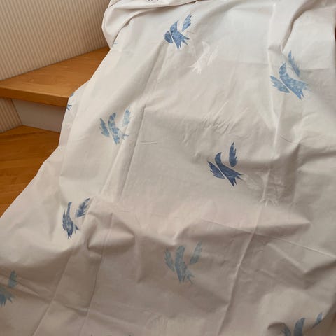 Ohuehko hyvälaatuinen valkoinen puuvillakangas. Kankaassa painantatyönä sinisiä ja valkoisia lehtiä sekä valkoisia lintuja.