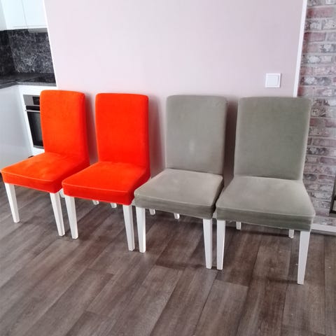 4 kappaletta vakaarakenteisia ruokapöydän tuoleja. Löytyy jonkin verran tahroja ja osumia, mutta ne saa varmasti hyvin piiloon pienellä maalaamisella.