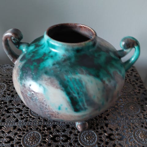 kork.korkeimmalta kohdalta n.14 cm. Litteä palanen irronnut pohjasta (viimeinen kuva. Ei vaikuta maljakon pystyssä pysymiseen. Vain nouto