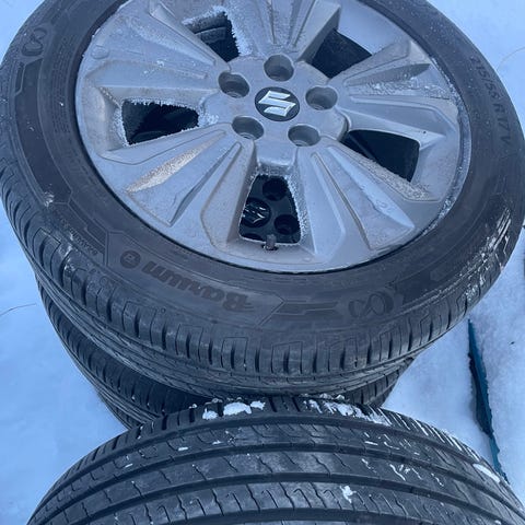 Tarjolla 16 tuumaiset Suzukin vanteet. Päällä on "loppu talven" ajettavat Continentalin nasrarenkaat. Yhdestä vanteesta puuttuu keskikuppi.