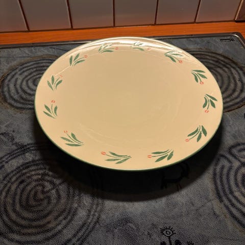 Keraaminen astiasetti, johon kuuluu kulho, kermakko, pieni kukkakuvioitu muki sekä kaksi erilaista kuppia omilla lautasillaan. Astiat ovat vaaleat ja niissä on vihreä reunus sekä yksinkertaisia koristemaalauksia. Sopii esimerkiksi kattaukseen kahville, teelle tai jälkiruoille. Materiaalina on lasitettu keramiikka.