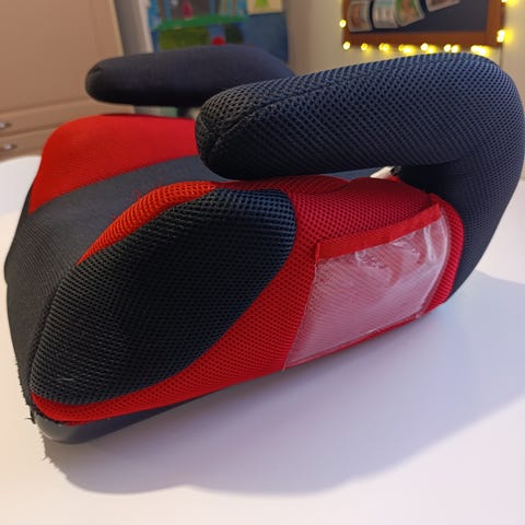 Lasten turvavyöistuin, korokemallinen istuinosa. Väri on harmaan, tummanharmaan ja punaisen yhdistelmä. Istuimessa on muovinen pohja ja pehmustettu päällinen. Korokeistuin on tarkoitettu käytettäväksi auton turvavyön kanssa isommille lapsille, jotka eivät enää käytä selkänojallista turvaistuinta. Soveltuu asennettavaksi auton takaistuimelle auton kolmipisteturvavyön kanssa valmistajan ohjeiden mukaisesti.