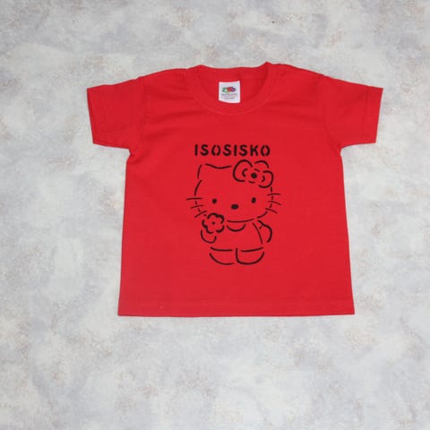 Uusi punainen t-paita, johon käsinpainettu kissa kasvo kuva ja minusta tulee isosisko teksti.