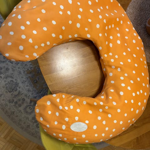 Myydään tukeva vihreä imetystyyny, joka madaltuu ja kapenee toista päätä kohden. Päällinen puuvillaa, sisus polyesteriä.
