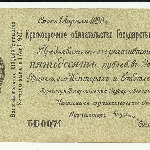Etelä-Venäjän 500 ruplan seteli vuodelta 1920. Setelissä on venäjänkieliset tekstit ja koristeellinen kuviointi molemmin puolin. Toisella puolella on arvomerkintä ja tekstit, toisella puolella monumenttikuvio ja vuosiluku 1920. Sopii esimerkiksi keräilykäyttöön historiallisena rahayksikkönä. hinta 5 e posti 2.50 e
