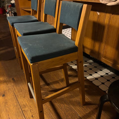 Annetaan kaksi baarijakkaraa. Ovat kunnossa, mutta molemmista puuttuu pari "tassua" jaloista.