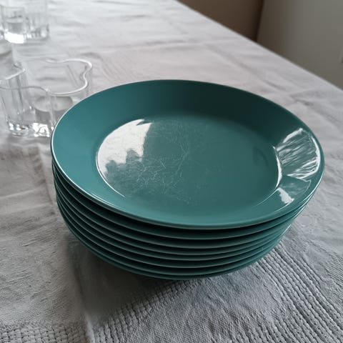 Lautasten koko n.17cm ja mukien tilavuus 2.5dl