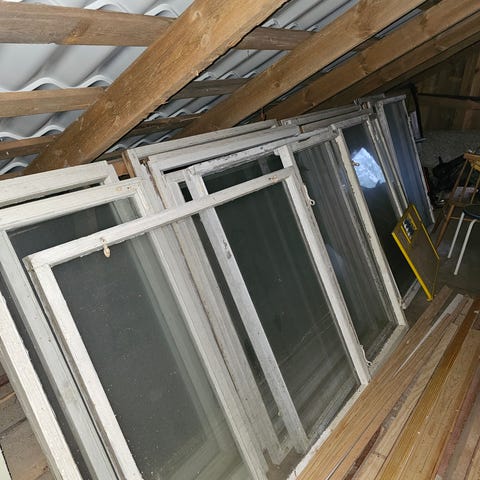 Käytöstä purettuja ikkunoita. Erikokoisia.