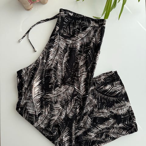 ChicMe housut naisille, koko L. Mustat, suoralahkeiset housut, materiaalina 97% polyesteriä, 3% spandexia. Vyötäröllä on kaksiosainen vyö hopeansävyisillä soljilla. Toisessa lahkeessa on koristeellinen, strasseilla koristeltu läppätasku. Sopivat monenlaiseen käyttöön.