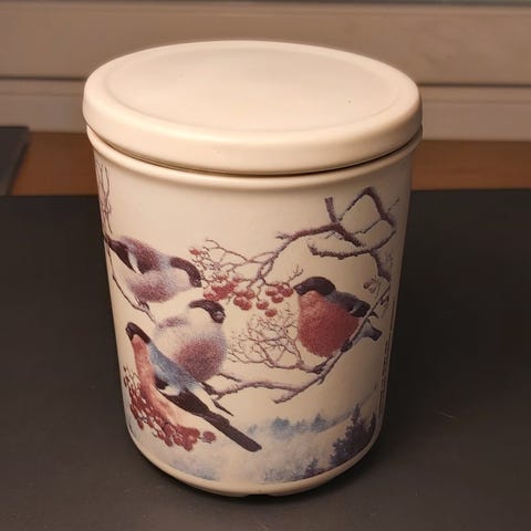 Purkkien kyljissä on lintuteemaiset kuvitukset metsä- ja talvimaisemissa. Soveltuvat esimerkiksi kuivatuotteiden, pienten tavaroiden tai keittiötarvikkeiden säilytykseen. Neutraali vaalea väri ja kuviointi sopivat monenlaiseen sisustukseen. (Tekoäly teksti)
