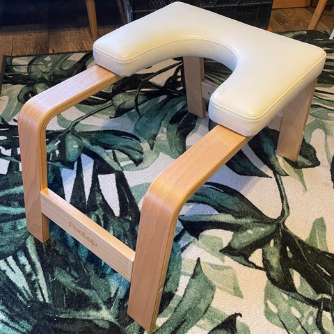 FeetUp joogapenkki, jossa puinen runko ja musta nahkainen pehmustettu "istuinosa". Käyttämätön. Alkuperäinen paketti avattu vain kuvien ottamista varten.