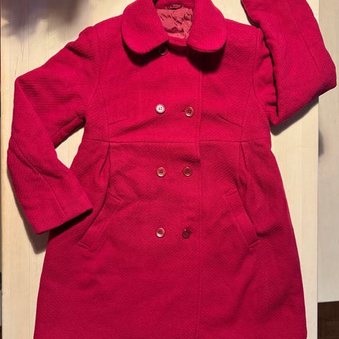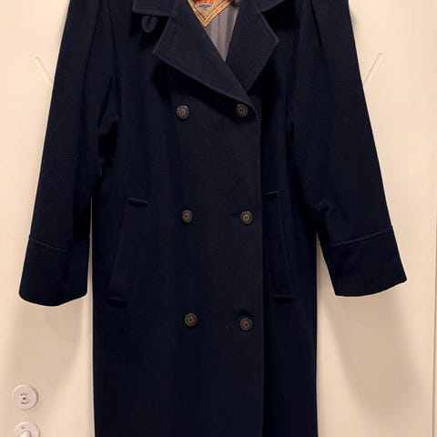 Olen käyttänyt takkia muutaman kerran ja ollut sen jälkeen pukupussissa. Ei vikoja eikä hajuja. Sivutaskut. Tyköistuva. Kaunis tamppi takana. Halkio takana. Täyspitkä polyester-vuori. 80% villaa, 20 % polyamidia. Irrotettava (yhdessä kuvassa irroitettu) musta sileä ja tiheä karva kauluksessa. Napeilla kiinnitettävä tekoturkis.