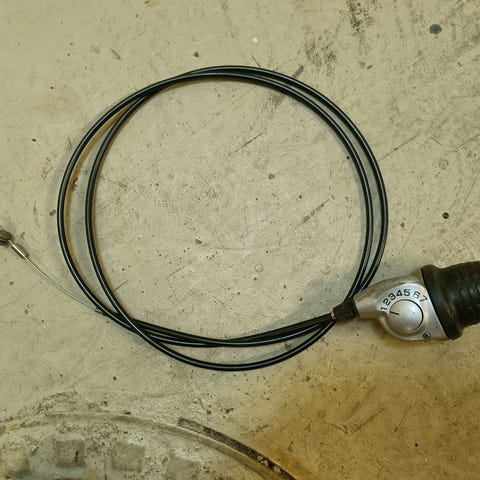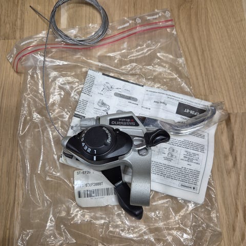 Kunnossa oleva yhdistetty vaihde- ja jarrukahva sekä vaihtaja, kuoren pituus 155cm, jarruvaijeri ja -kuori puuttuu
