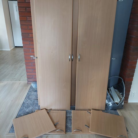 Käytöstä poistettu sarja kaapinovia. Myydään kokonaisuutena. Kuvan mukaiset vetimet kiinni ovissa. Korkeintaan pientä käytön jälkeä. Ei saranoita tms mukana.