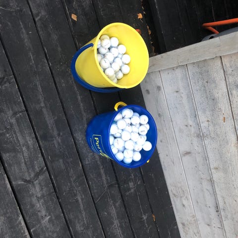 Sekalainen erä golfpalloja. Mukana useita eri merkkejä ja malleja, pääosin valkoisia palloja sekä joitakin värillisiä (mm. keltaisia, vihreitä ja pinkkejä). Palloissa on tavallinen golfpallon koko ja pintakuviointi. 1kpl 80c. 2kpl 1,50€ 10 kpl 5,50€.