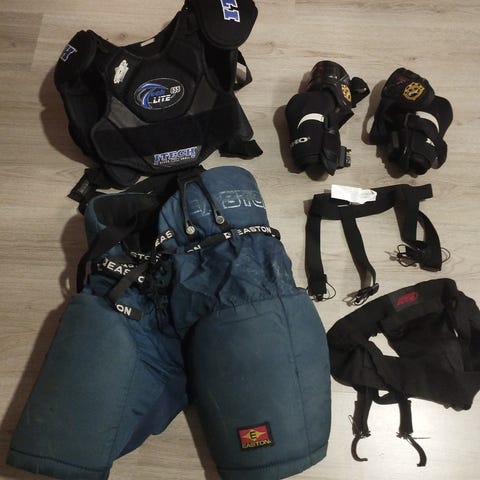 Jääkiekkovarustesetti, johon kuuluu usean valmistajan varusteita. Setissä on Bauerin hartiasuojat ja Bauer Nexus -säärisuojat, Reebokin kaulasuoja sekä Eastonin punainen jääkiekkokassi. Lisäksi mukana on mustat jääkiekkohousut. Tarkemmat koot ja mallit saat viestillä. Sopii M tai L kokoiselle. Aikuiset.
