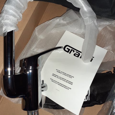 Hana soveltuu keittiöaltaaseen tai kodinhoitohuoneen altaaseen. Mukana näkyvät kupariputket ja kiinnitysosa altaaseen asennusta varten.