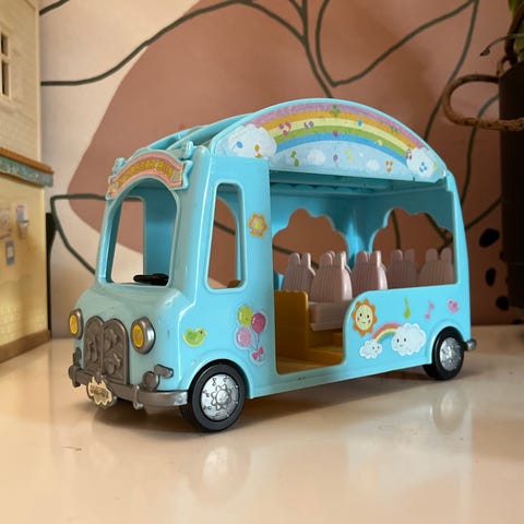 Sylvanian Families Woodland Bus erinomaisella varustuksella: torvi, käynnistyskampi, iso matkalaukku, pysäytysmerkki ja kaksi kakkua. Mikään ei ole rikki ja kaikki tarrat ovat paikoillaan. Bussin yläkerrassa on kantokahva, josta bussia voi kantaa. Todella harvinainen löytää tässä kunnossa ja tällä varustuksella. Bussi on todella suuri – jopa sininen perheauto on paljon pienempi (viimeinen kuva).