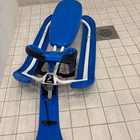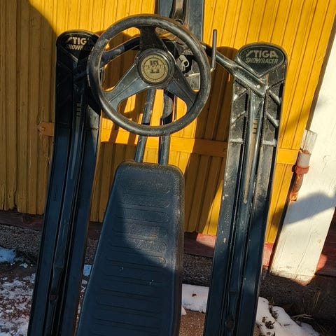 Toimiva rattikelkka tarpeettomana. Etusuksi uusittu hiljattain, jalas-sukset enemän kuluneet