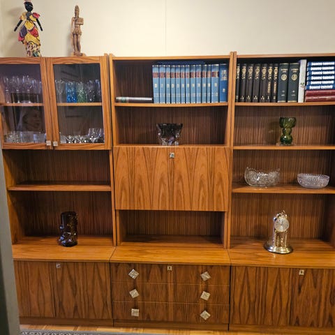 Todella tyylikäs ja käytännöllinen kokonaisuus, jossa on runsaasti hyllytilaa, vitriinikaapit sekä laskettava taso (baaritaso / työskentelytaso). Sopii erinomaisesti olohuoneeseen, työhuoneeseen tai ruokailutilaan.