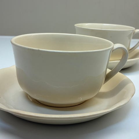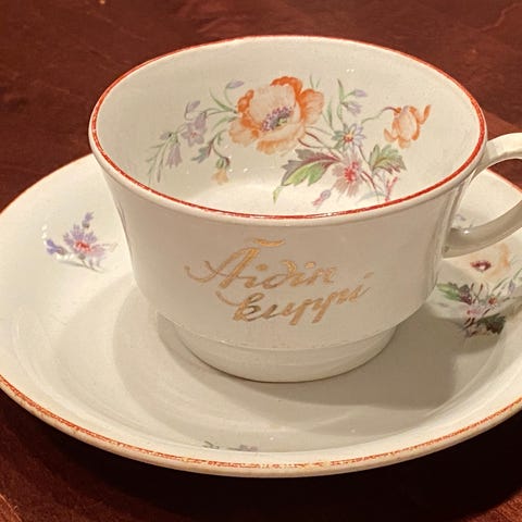 Kuppi ja lautanen ovat alkuperäinen pari. Pientä kulumaa kullatuissa reunoissa