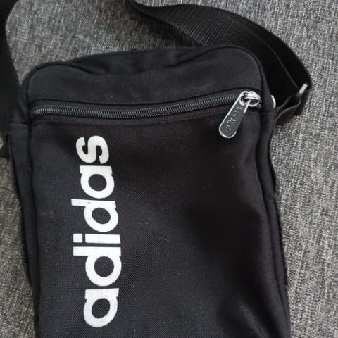 Adidaksen musta laukku. Noin-mitat; korkeus 29cm, leveys 25cm ja syvyys 12-15cm. Hihna säädettävissä, kaksi vetoketjullista lokeroa. Käyttö jo näkyvissä lähemmin tarkasteltuna; pinnassa murtumia, toinen vetoketjun vetimistä puuttuu ja vuoressa tahraa joka ei pyyhkimällä lähtenyt.