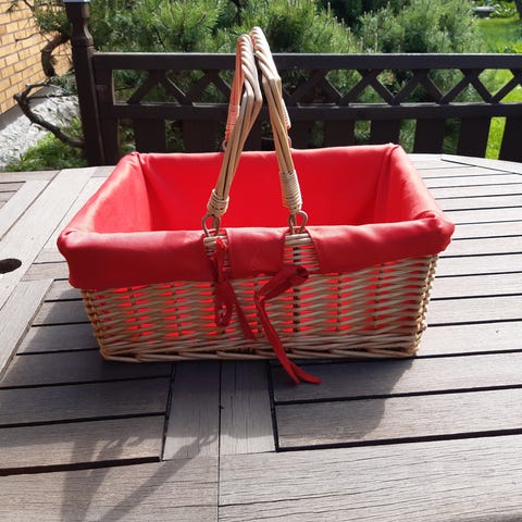 Valkoinen pajukori pyörillä, sisällä irrotettava kangas.