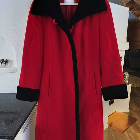 Hyvälaatuinen, musta nilkkapituinen villakangastakki. Koko 34-36, pitkä, esim. 160-senttinen tarvinnut korolliset kengät.