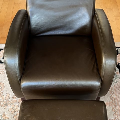 Ehjä ja siisti konjakinruskea nahkarahi. Puhdas ja hajuton. Kaksi nahkanappia korvattu metallinapeilla, joissa samanlainen kuvio. Kork. 31 cm, halk. 50 cm. Sopii myös istuimeksi.