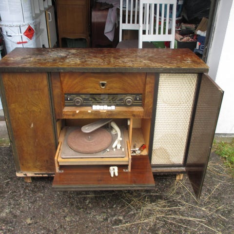 Normaalista poikkeava vintage levysoitinkaappi myytävänä. Toimintaa ei ole testattu. Mukana varaosia ja puhdistus tarvikkeita. Takakulmassa korjaus. Muilta osin kunto hyvä. Maadoittamaton pistoke. Toinen johto poikkaistu.