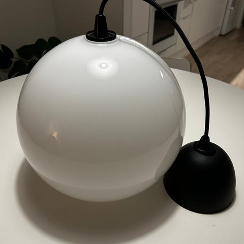 Ikean lasikupuvalaisin ripustusjohdolla ja ylimääräinen ripustusjohto. Molemmissa pistotulpat.