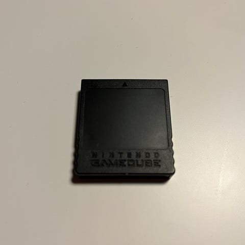 Nintendo GameCube muistikortti. Väri musta. Tarkoitettu Nintendo GameCube -pelikonsolin pelitallennusten ja asetusten tallentamiseen ja siirtämiseen yhteensopivien pelien kanssa.