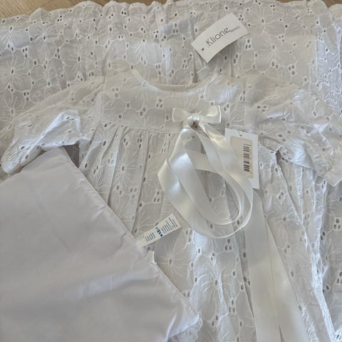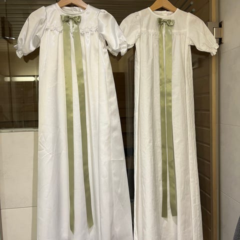 Ihanaa satiini kastemekko. Takana nappikiinnitys, helppo pukea päälle ja pois.