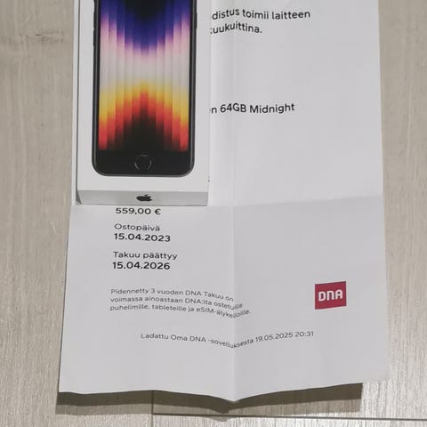 Apple iPhone SE gen3. Siistissä kunnossa. Pieniä mikronaarmuja näytössä, ei huomaa käytössä eikä tunnu käyttäessä. Akunkunto 95% ja kestää hyvin päivän. Täydellinen taskuraketti ja tehokas pieni puhelin a15 chipin ansiosta mikä on sama kuin esimerkiksi iPhone 13 puhelimissa.