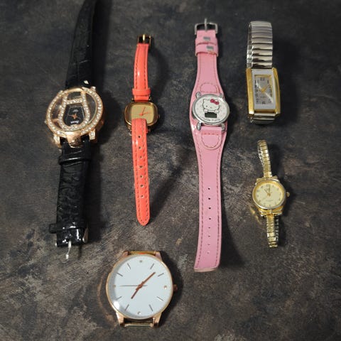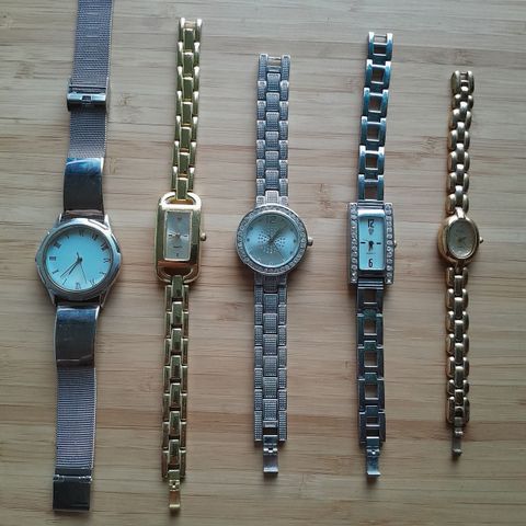 Kuusi paristolla toimivaa kelloa. Eivät nyt käy, kun patterit puuttuu. Neljässä hyvät rannekkeet.