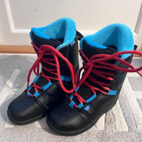 Head lasten lumilautakengät. Kengän koko on 35/36,5 (225/235 mm), valmistajan kokomerkinnän mukaan noin 4/5. Väritys on musta ulkopinta sinisillä yksityiskohdilla ja kirkkaanoransseilla nauhoilla, sisävuori on sininen. Kengissä on perinteinen nauhakiinnitys ja pehmustettu varsi. Soveltuvat lasten lumilautailuun ja talviseen ulkoiluun.