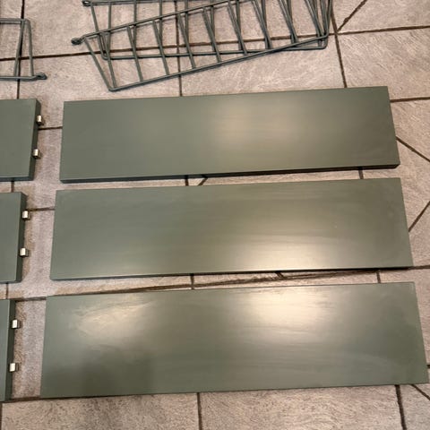 Artek string hylly. Salvian värinen. Yhdessä hyllyssä hiusväriä.