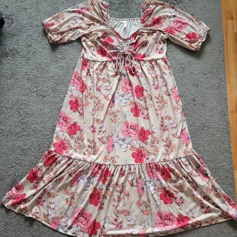 Vuoreton helppohoitoinen mekko arkeen tai juhlaan. Kainalosta kainaloon 53 cn ja olka-helma 96 cm. Uudenveroinen, ei rypisty. Kauniit värit.