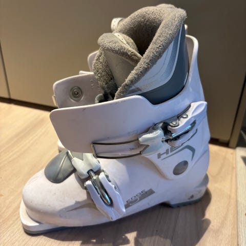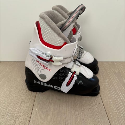 Head lasten laskettelumonot, pohjan pituus 240 mm. Väri musta/valkoinen punaisilla ja monivärisillä yksityiskohdilla. Muovikuori, kaksi solkikiristystä ja kumipohja. Soveltuvat lasten rinnelaskuun ja yleiseen hiihtokeskus käyttöön.