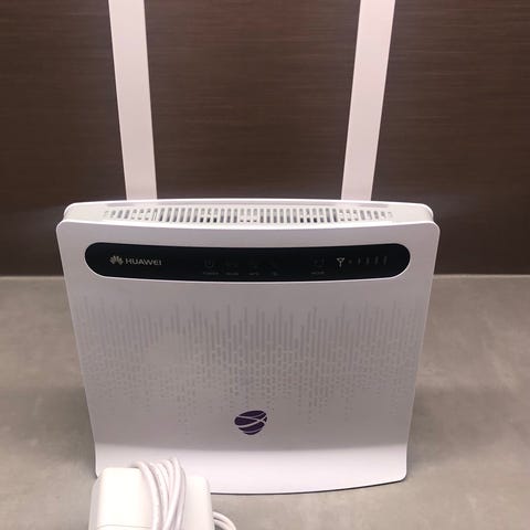 Huawei sim kortillinen 4G LTE -reititin. Laitteessa on kaksi ulkoista antennia, useita Ethernet LAN -portteja sekä WAN-portti kiinteää verkkoyhteyttä varten. Takapaneelissa on myös USB-liitäntä ja virtaliitin. Reititin soveltuu mobiililaajakaistan jakamiseen useille laitteille sekä langattomasti että verkkokaapelilla. Mukana virtalähde ja virtajohto kuvien mukaisesti.