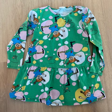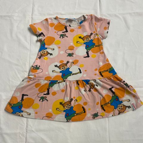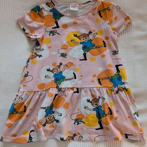 Martinex merkin Peppi Pitkätossu mekko. Koko 104 mutta reilua kokoa eli oli ainakin meillä pitkään käytössä.