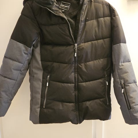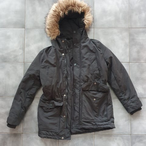 Tummanharmaa Bershka miesten talvitakki koko S. Karvareunus huppu, povari, isot näppäritaskut.