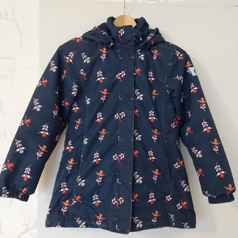 Tyttöjen talvitakki, kulumaa, mutta ehjä. Hihoissa resorit. Vyötäröllä ja helmassa kiristys. Kuvassa väri taittaa ruskeaan, mutta pohjaväri ja sisävuori violetimmat. Väri lähinnä oikeaa viimeisessä kuvassa