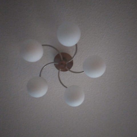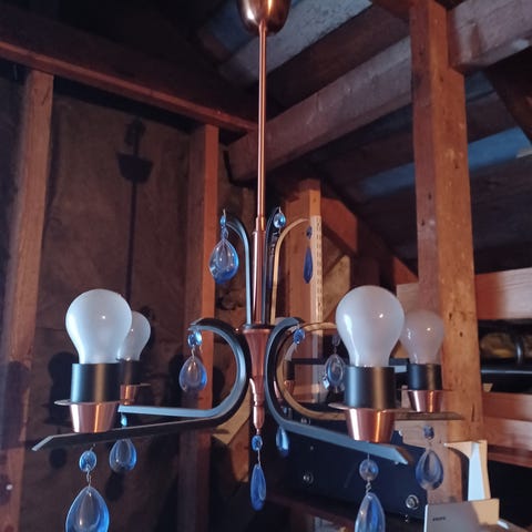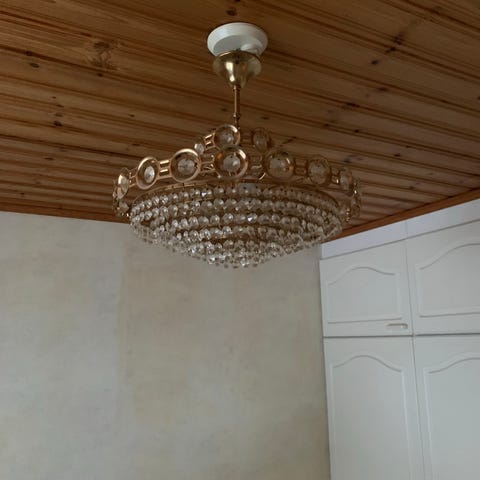 Myydään kaunis ja näyttävä lasinen kattokruunu, jossa useita valopisteitä ja koristeellisia lasiosia. Valaisin luo pehmeää tunnelmavaloa ja toimii näyttävänä sisustuselementtinä.
