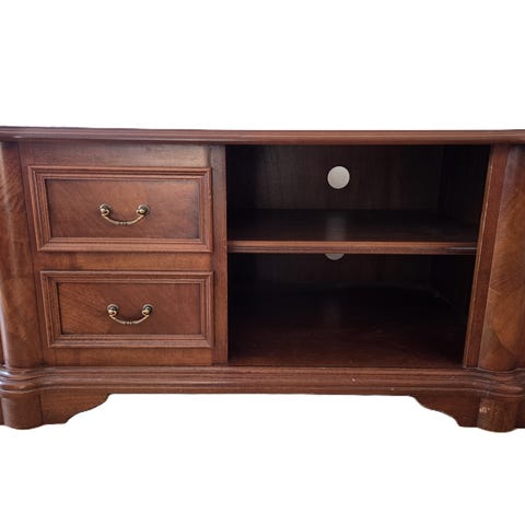 Kohtuu siisti ja toimiva mattavalkoinen tv-taso. Jotain käytönjälkeä löytyy, taustalevyä sahattu johtojen tieltä.