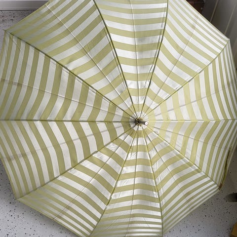 Vallilan sateenvarjo Tavastia-kuviolla. Huom! Kaksi metalliosaa vaurioitunut (näkyy kuvassa), joten avatessa varjo pitää käsin "auttaa" auki. Muuten ei haittaa käyttöä.
