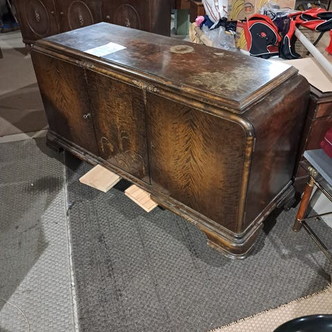 Puuinen lipasto kaiverruksilla ja ovikaapilla