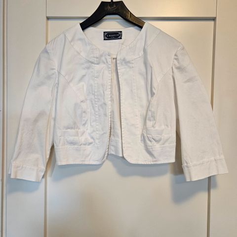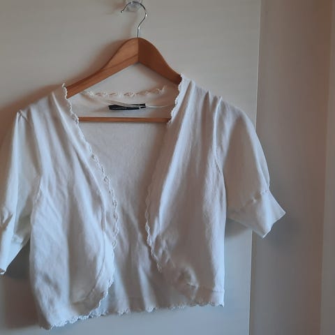 Vaaleanpunainen, pörröinen bolero. Ei kokolappua. Pituus 37 cm, hihat 43 cm.