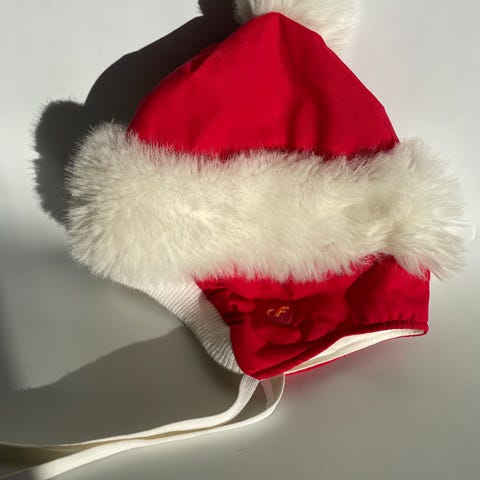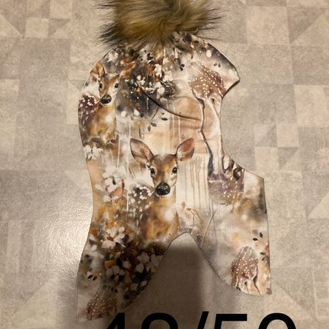 Lastenhattu turkista, koko 50 -53, unisex-malli. Hatun ulkopinta on beigeä turkismateriaalia ja sisäpinta pehmeää, vaaleaa turkista. Hattu peittää pään ja osittain korvat, ja sopii viileämpiin säihin.