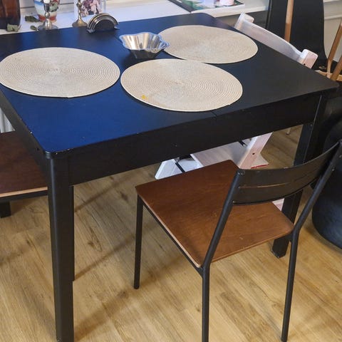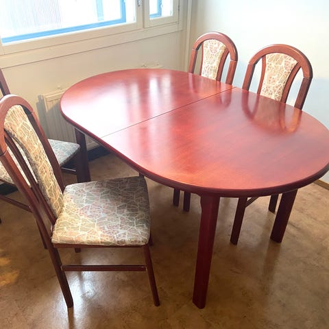 Jatkettava ruokapöytä ja 4 tuolia pöydän mitat pyöreänä halkaisija 119cm, jatkettuna 157x119cm. Tuoleissa kolhuja, mutta tahrattoman kankaat ja hyvä jousitus.
